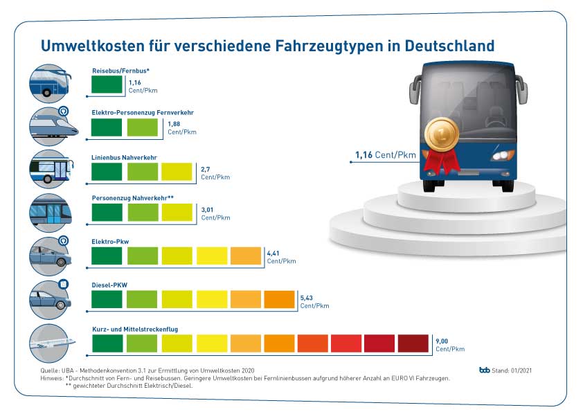 Wir alle machen uns Gedanken, wie wir unseren Beitrag zum Klimaschutz leisten können. Durch die Anreise mit einem Reisebus und nicht etwa dem eigenen PKW lassen sich die CO2 Emissionen bereits deutlich reduzieren. Was Klima- und Umweltfreundlichkeit betrifft sind Fern- und Reisebusse die einsamen Spitzenreiter im Vergleich zu anderen Verkehrsmitteln.